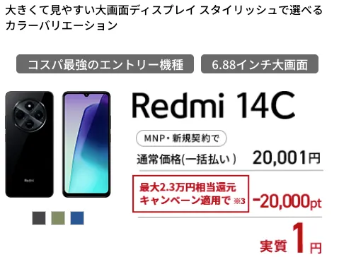 他社から乗り換えることで、本来22,001円のスマホが 1円で購入できる仕組みになっています。