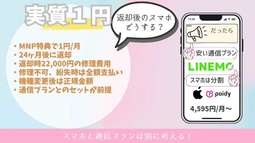 ただし、その1円スマホにはカラクリがあり、他社からの乗り換え(MNP)特典 × 24カ月後の返却が前提の「端末購入プログラム」 で成り立っています。
