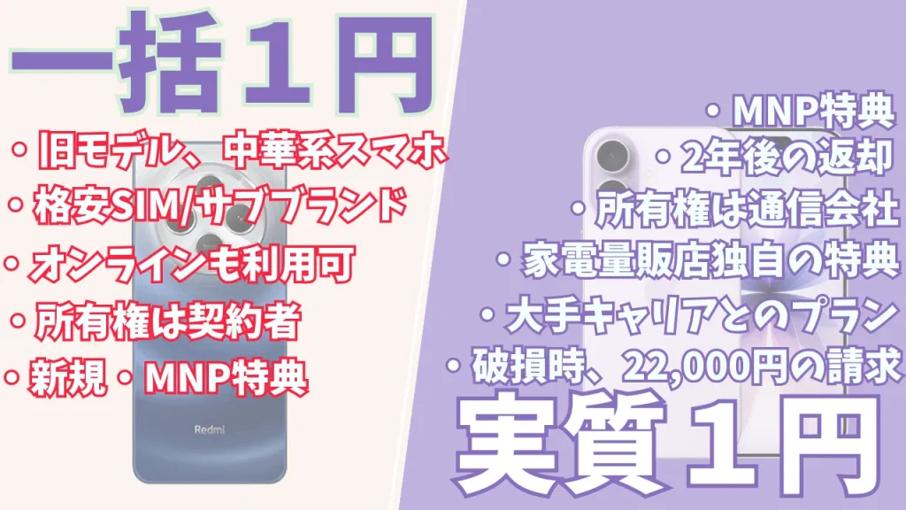 「実質1円スマホ」は MNP(乗り換え)を前提とした特別価格 のため、同じキャリアで端末を返却して機種変更をすると、次の端末代は割高になりやすいのが実情です。