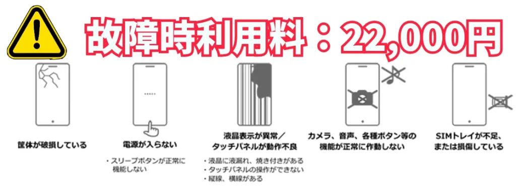 返却時にガラス割れや背面の破損、電源が入らないといった不具合があった場合でも、故障時利用料として最大22,000円の支払いで済むよう設定されています。