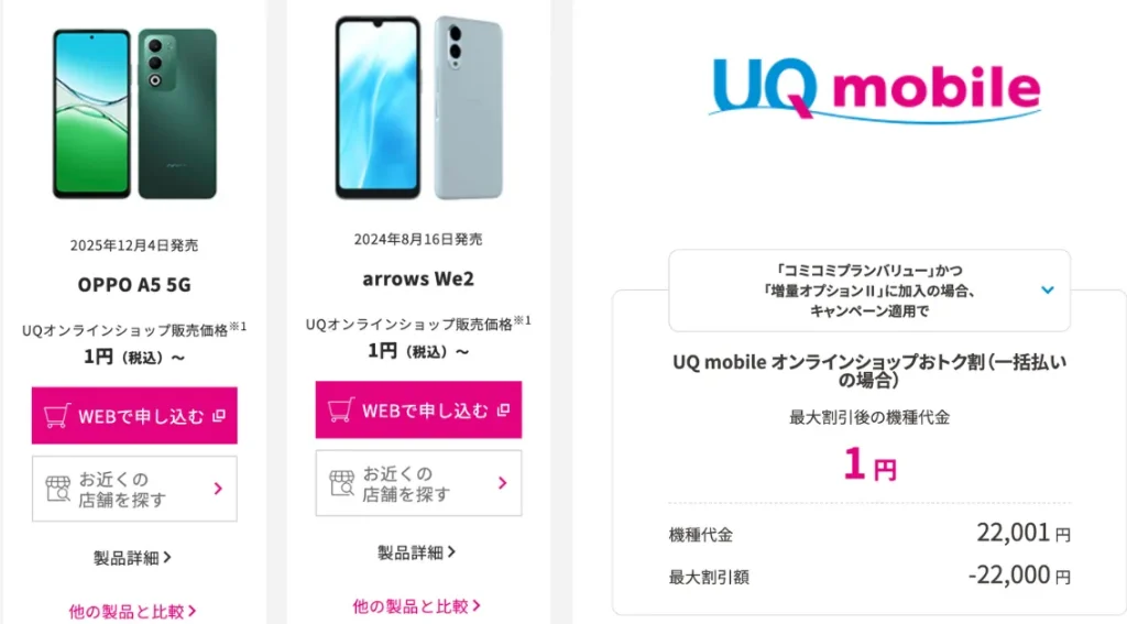 特にGEOはUQ mobileの正規取扱店でもあるため、UQ mobileを契約することで中古端末をよりお得に購入できるケースがあります。