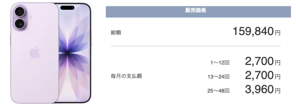 また、25カ月目以降も端末を使い続けたい場合、iPhone 17 と比べて負担額を抑えられる点も、iPhone 16e の魅力 です。