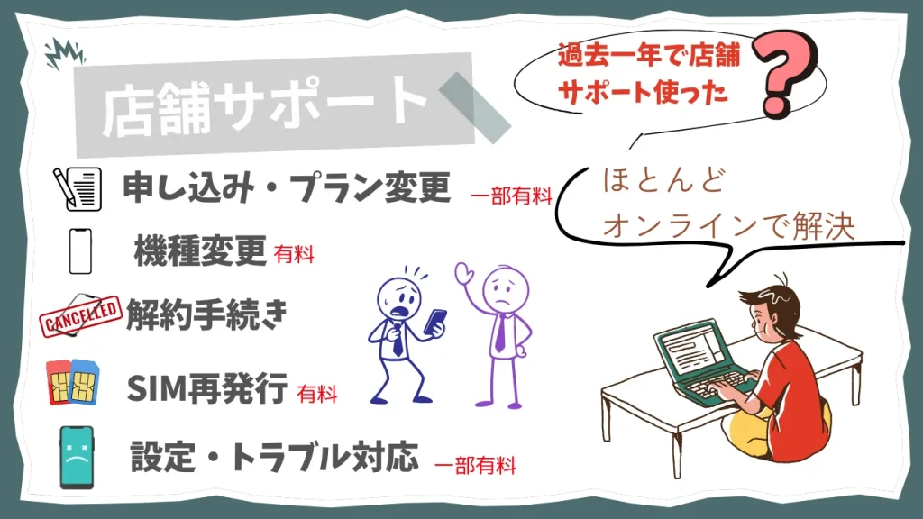 これまで、サポートが充実しているdocomoやUQ mobileを契約していましたが、実際に利用したサポート内容は、機種変更など、今ではオンラインで簡単に済ませられるものばかりでした。