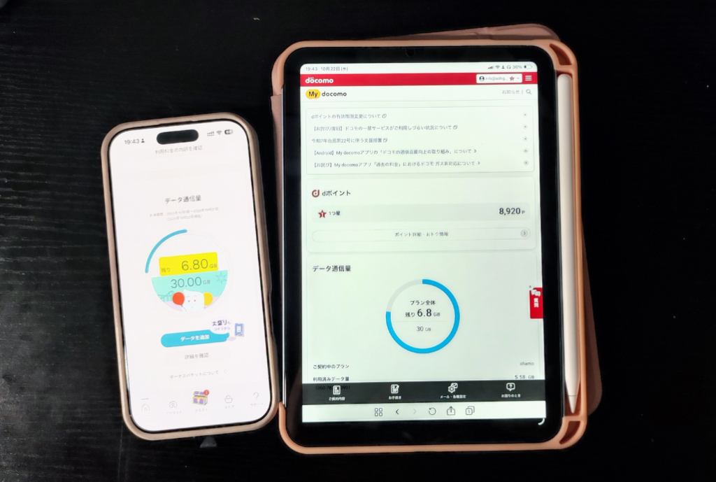 ahamoのサービスになってしまいますが、iPadなど第三の端末とデータを共有できる「データプラス」を利用して効率的にギガを消費しています。
