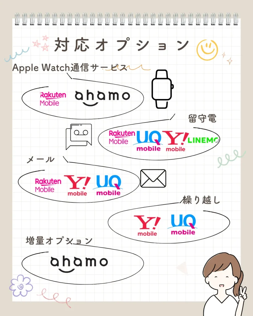 一方で、Apple Watchの通信サービスやデータ追加オプションは、ahamoや楽天モバイルが対応しています。