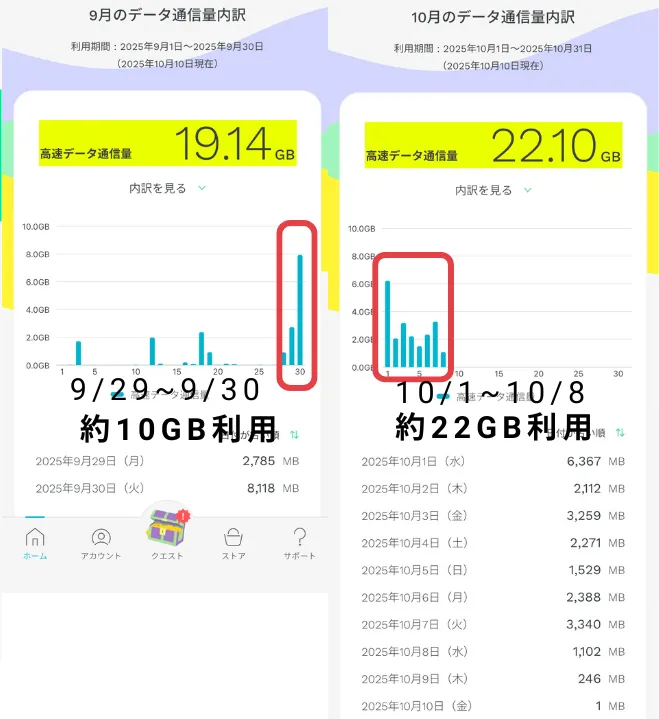 海外で約32GBを使用しました。(月を跨いでいるため、30GB以上利用できてます。)