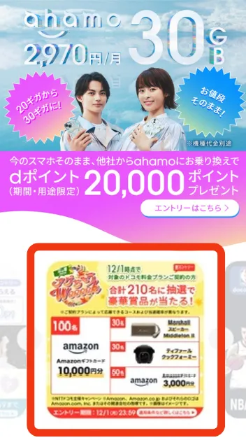 ahamoは他社からSIMの乗り換えで、20000ポイントのdポイントが貰えるキャンペーンを実施中です。