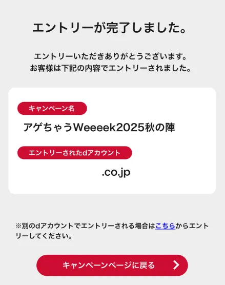 「20,000ポイントキャンペーン」に再度エントリーし、「既にエントリー済みです。」と表示されていれば、エントリーは完了しています。