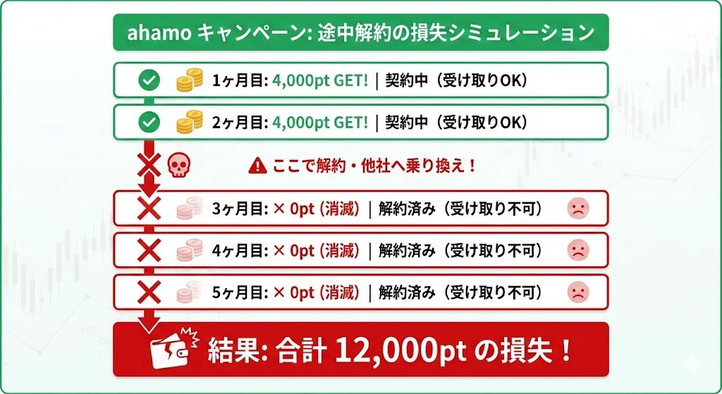 キャンペーンにエントリーした翌月までにahamoを利用開始すると、開通の翌々月から5か月間にわたって、毎月4,000ポイントずつdポイントが還元されます。