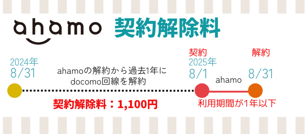 ahamoでは、過去1年以内にドコモ回線の解約があった場合、1,100円の契約解除料が発生します。