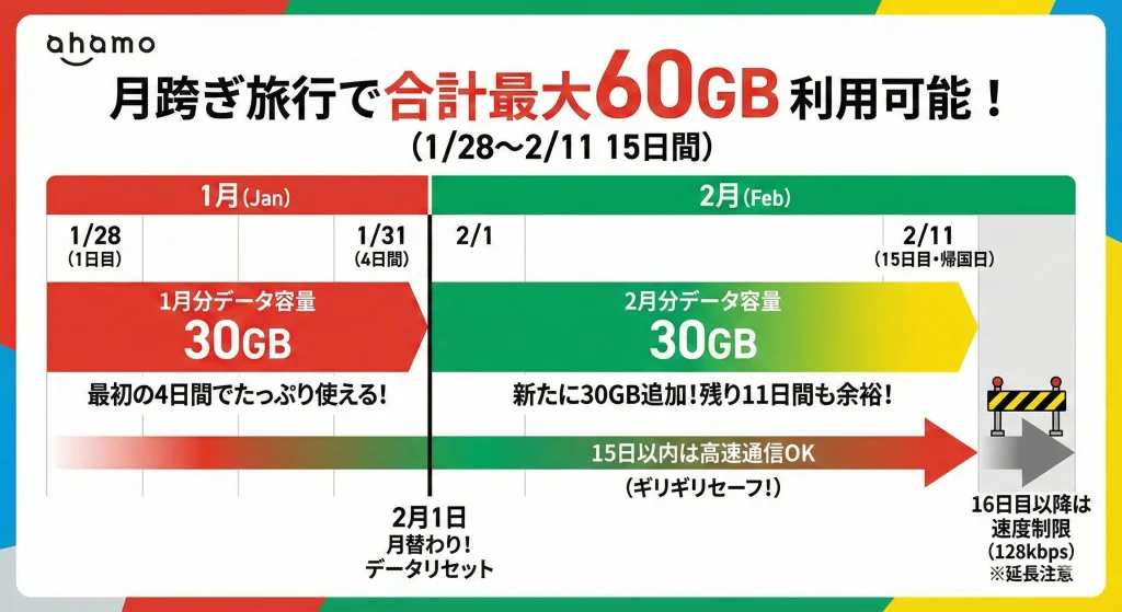 「月末から翌月初めにかけての旅行」であれば、15日以内であれば合計60GBのデータ通信が可能。です。