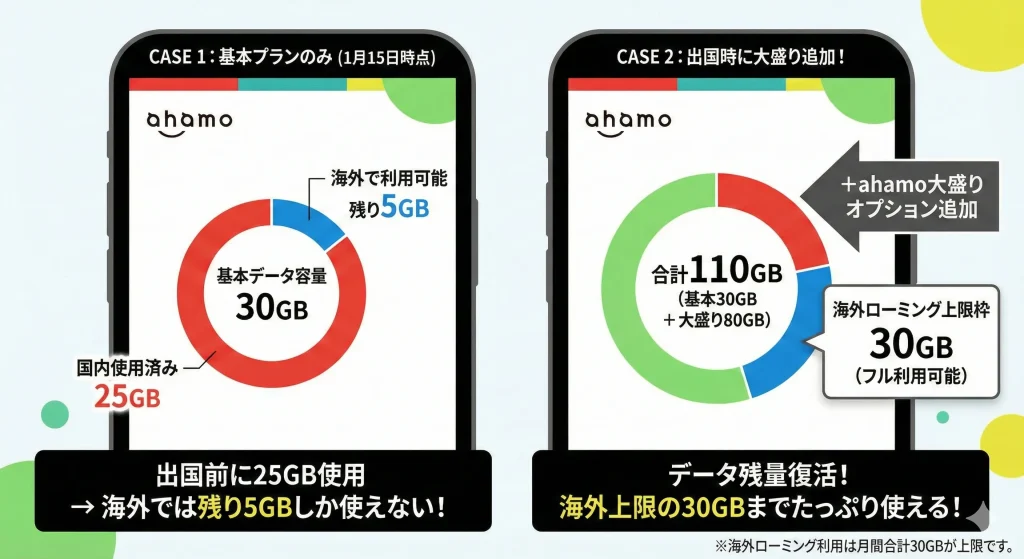 もし出国前に日本国内で30GBを使い切ってしまった場合でも、大盛りオプションを追加契約すれば、海外での利用枠(最大30GB)をフルに活用できるようになります。