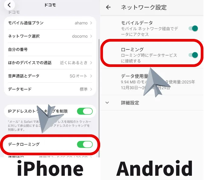 - 設定は「データローミング」をONにするだけ