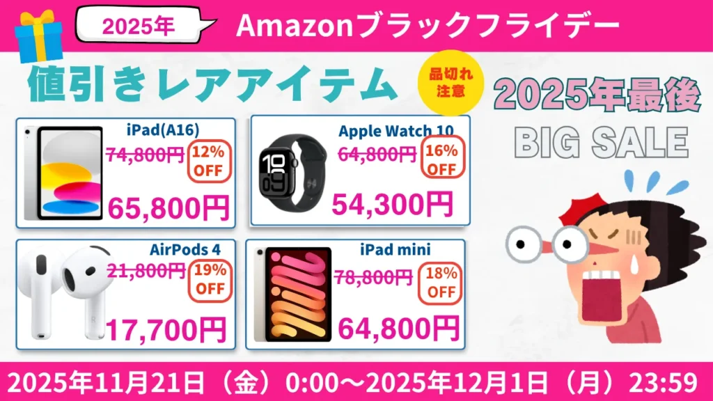 2025年Amazonブラックフライデーの予告では旧モデルのApple Watch 10がセール対象になっています。