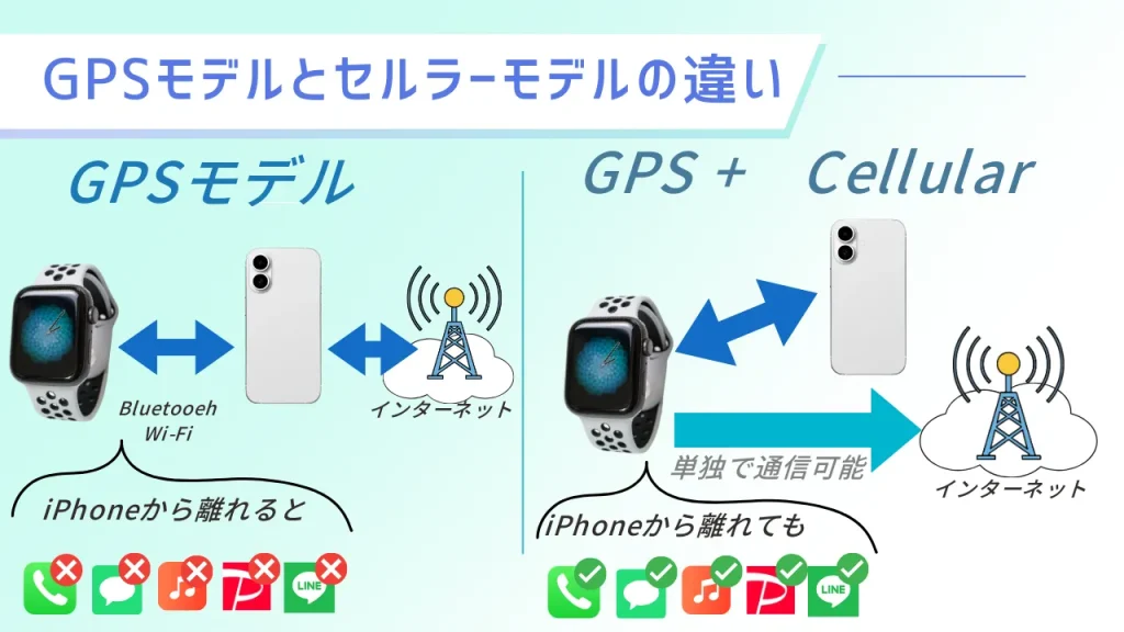 Apple Watchの「GPSモデル」と「GPS + Cellularモデル」の主な違いは、単独で通信ができるかどうかです。