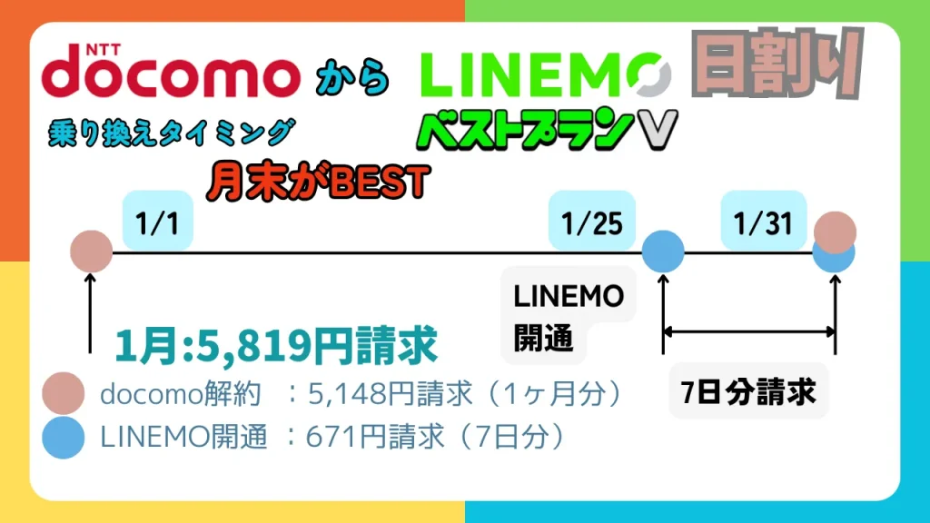 例えば、1月25日にドコモからLINEMOへ乗り換えた場合、LINEMOの初月料金は1月25日〜31日までの7日間分が日割りで計算されます。
