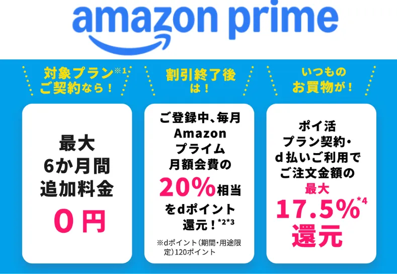 dポイントはAmazonでも利用できるため、Prime会員の方はAmazonで直接登録するよりもドコモ経由の方がお得です。