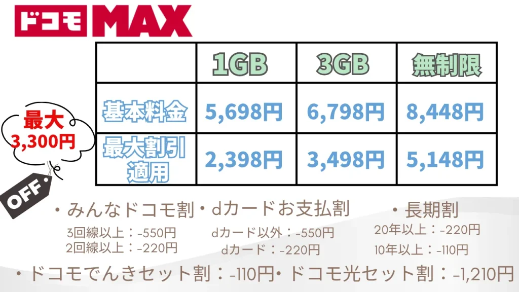 ドコモMAXは、みんなドコモ割やドコモ光セット割など、すべての割引を適用すると最大3,300円の割引となり、無制限プランを実質月額5,148円で利用できます。