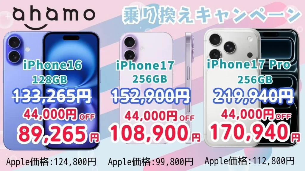 ahamoは他社から乗り換えでiPhone16を44,000円割引の101,200円で販売しています。