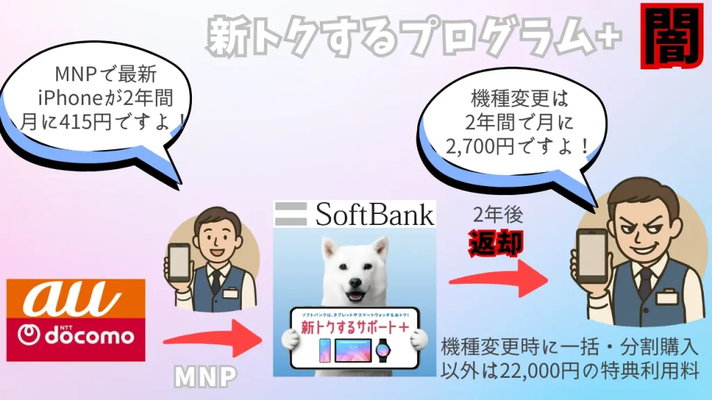 ソフトバンクの「新トクするサポート+」は「特典利用」や「特典A/特典B」と間際らしい名称で、従来の返却プログラムに最大22,000円の特典利用料を上乗せさせられた非常に複雑なプログラムです。