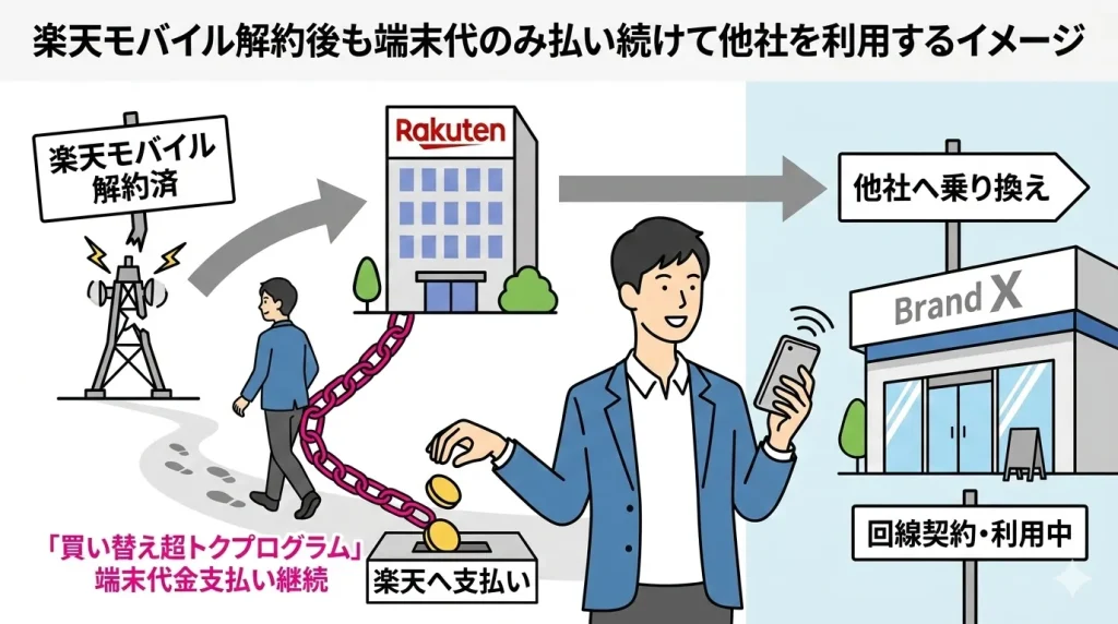 楽天モバイルから分割で端末を購入したり、払いで購入していて「買い替え超トクプログラム」を利用した場合、楽天モバイルを解約後も端末代は楽天モバイルに支払う必要があります。