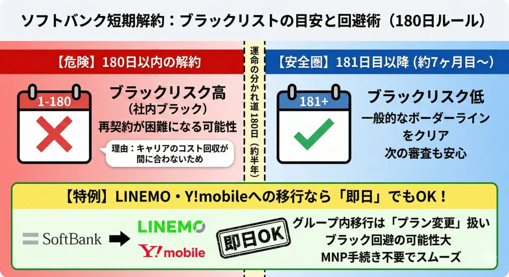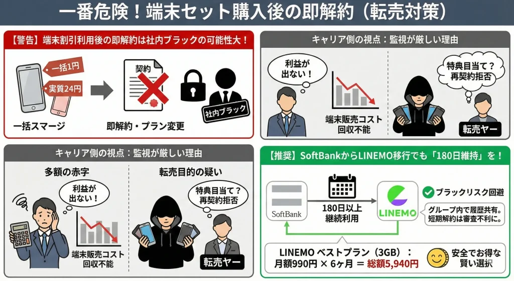 契約期間や履歴は同じソフトバンクグループ内で共有されているため、乗り換え後にLINEMOを短期解約してしまうと、転売目的などを疑われ、今後の審査で不利になる(ブラックリスト入りする)リスクが高まります。