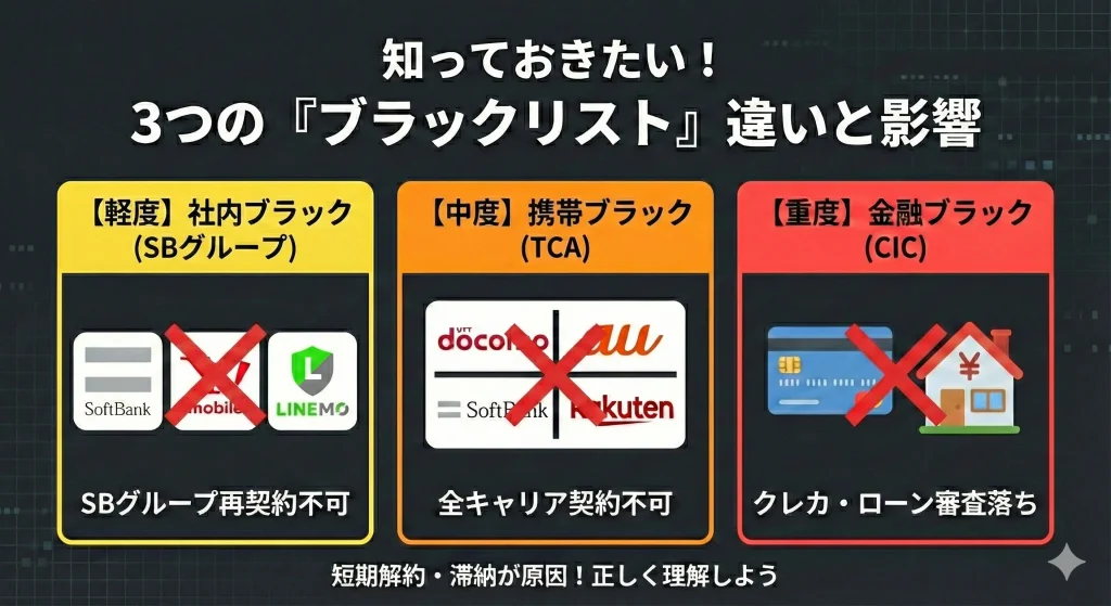 | 影響範囲 | SB・ワイモバ・LINEMO の再契約が困難 | 全キャリア | クレカ・ローン の審査に通らなくなる |